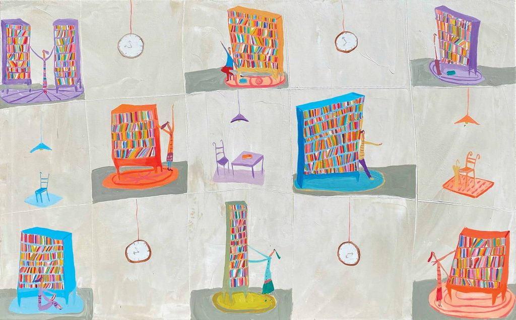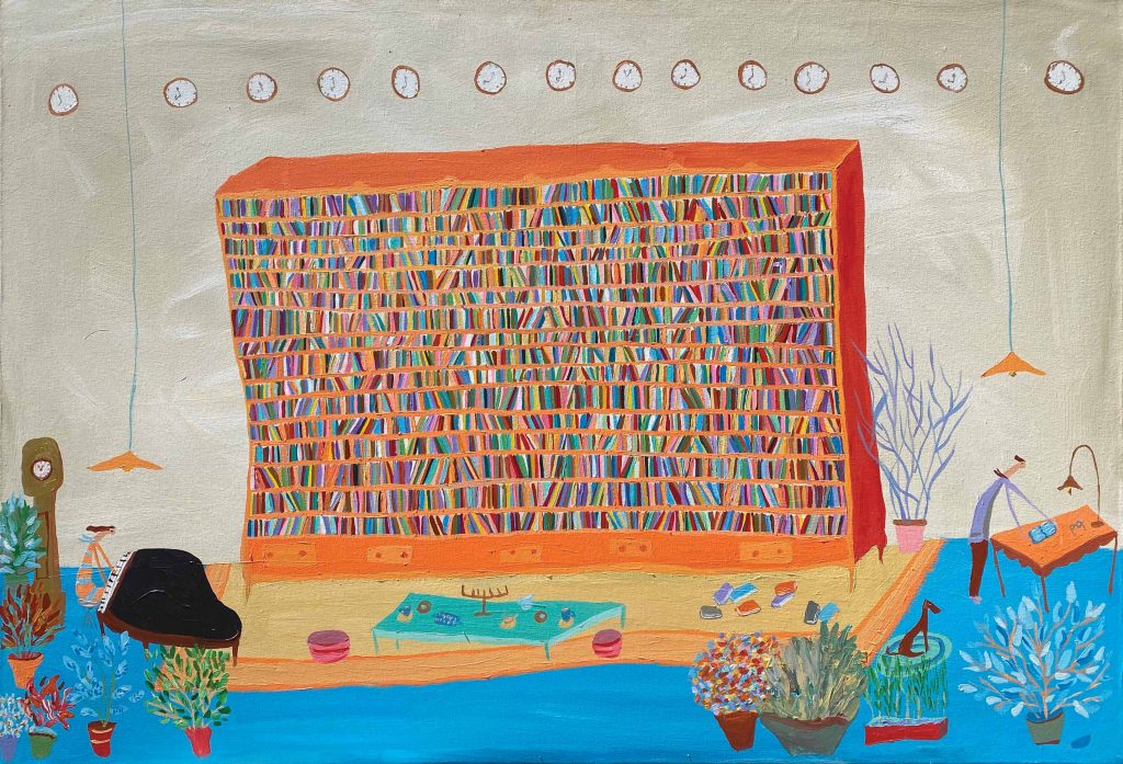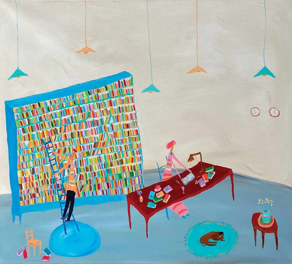 La scelta non è certo casuale: il rapporto di collaborazione, amicizia e stima che lega Gimenez ad Ezio e Eugenia Walter li ha portati, nel tempo, a produrre insieme numerosi progetti espositivi monografici (Un mondo al microscopio, 2005; Tutto è questione di tempo, 2007; In transito, 2012; Non tutti i mondi sono uguali, 2016; Collezionista di momenti, 2018), oltre a opere site specific, incontri e performance (Lido di Caslano, 2003; Parola di madre/parola di padre, 2009; Concerto di pittura, 2014; Long Lake Festival, Lugano 2019; Volver, 2021). Non stupisce, dunque, che per questa speciale occasione l’artista argentino torni a Lugano con una nuova personale, la sesta, interamente dedicata al tema dei libri, ai luoghi della lettura e della contemplazione.